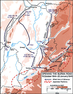 Reaching the Burma Road now lay within the grasp of the Allied forces. The next phase of the campaign would involve a larger role for the Mars Task Force. General Sultan wanted to send the force up the line of the Shweli River to threaten the Burma Road and the rear of Japanese forces opposing the advance of the Chinese 38th and 30th Divisions from Bhamo. But the 124th Cavalry, many of whose troopers still wore the old high-top cavalry boots, first had to make the killing hike from Myitkyina south through the rugged mountains to the Shweli. Making their way along narrow paths which took them from deep valleys to peaks above the clouds, the men of the 124th finally reunited with the 475th at the small village of Mong Wi in early January 1945. From there the Mars Task Force moved east to drive the enemy from the hills overlooking the Burma Road. Bringing up artillery and mortars, the Americans opened fire on the highway and sent patrols to lay mines and ambush convoys. After the experience with GALAHAD, however, Sultan and the force's commander, Brig. Gen. John P. Willey, were anxious not to risk the unit's destruction by leaving it in an exposed position astride the road. The Mars Task Force may not have actually cut the Burma Road, but its threat to the Japanese line of retreat did hasten the enemy's withdrawal and the reopening of the road to China. While Y Force advanced southwest from the Chinese end of the Burma Road toward Wanting, the Chinese 30th and 38th Divisions moved southeast toward Namhkam, where they were to turn northeast and move toward a linkup with the road at Mong Yu. To oppose this drive, the Japanese had deployed the 56th Division at Wanting, troops of the 49th Division at Mong Yu, and a detachment at Namhkam, but these units planned to fight only a delaying action before retreating south to join the defense of Mandalay. They withdrew as soon as the Chinese applied pressure. As the Marsmen were establishing their position to the south, the 30th and 38th Divisions captured Namhkam and drove toward Mong Yu. On 20 January advance patrols of the 38th linked up with those of Y Force outside Mong Yu. Another week proved necessary to clear the trace of any threat from Japanese patrols and artillery fire, but on 28 January the first convoy from Ledo passed through on its way to Kunming, China. In honor of the man who had single-mindedly pursued this goal for so long, the Allies named the route the Stilwell Road. AnalysisHistorians have found it fashionable to characterize the CBI as a forgotten theater, low in the Allied list of priorities. To be sure, the European, Mediterranean, and Pacific theaters all enjoyed greater access to scarce manpower and material than the CBI, which had to cope with an extended line of supply back to the United States. Only a few American combat troops served in China, Burma, or India. Yet one can hardly call the CBI an ignored theater. It occupied a prominent place in Allied councils, as Americans sought an early Allied commitment to reopening China's lifeline so that China could tie down massive numbers of Japanese troops and serve as a base for air, naval, and eventually amphibious operations against the Japanese home islands. The American media, with its romantic fascination with China and the Burma Road, followed the campaigns closely and kept its audience informed on Vinegar Joe Stilwell and Merrill's Marauders. Interest in the theater did drop after early 1944 as estimates of China's military capability declined, but Allied leaders continued to keep a close eye on developments in a region where they still felt they had much at stake. For the American supply services, their performance in the CBI theater represented one of their finest hours. The tremendous distances, the difficult terrain, the inefficiencies in transport, and the complications of Indian politics presented formidable obstacles to efficient logistics. Nevertheless, by early 1944, American logisticians had developed an efficient supply system whose biggest problem was the time needed to ship material from the United States. The supply services expanded the port capacity of Karachi and Calcutta, enhanced the performance of India's antiquated railroad system through improved maintenance and scheduling, and developed techniques of air supply to support Chinese and American forces in the rugged terrain of North Burma. Despite the skepticism of the British and other observers, American engineers overcame the rugged mountains and rain forests of North Burma to complete the Stilwell Road which, joined to the old Burma Road, reopened the line to China. A tremendous feat of engineering, the Stilwell Road deservedly earned considerable applause. Stilwell himself has received more mixed reviews. A fine tactician, he maneuvered his Chinese-American forces with considerable skill in the campaign to drive the Japanese from the Hukawng Valley, and he showed commendable boldness in the decision to strike for Myitkyina before the monsoon. In the end the gamble barely paid off, but it did succeed. Stilwell's record indicates that he would have likely performed quite well as a division commander in Europe, the role that Army Chief of Staff General George C. Marshall had in mind for him before his appointment to the CBI theater. Unfortunately, most of Stilwell's responsibilities at the CBI emphasized administration and diplomacy, areas for which he possessed much less aptitude than for field command. He had little patience for paperwork, and he lacked the tact to reconcile the differing viewpoints of the nations involved in the CBI. Admittedly, in his three years in the theater, he probably held more concurrent positions than should ever have devolved on one man.