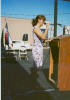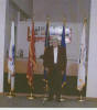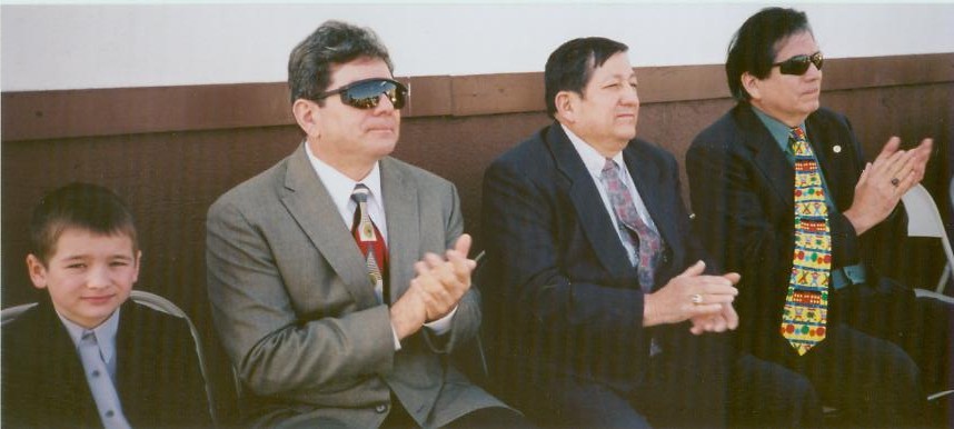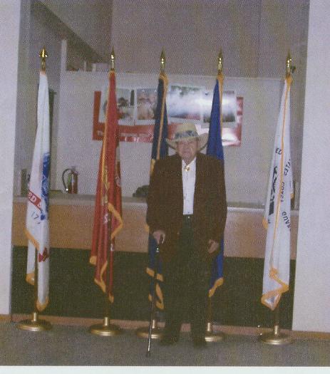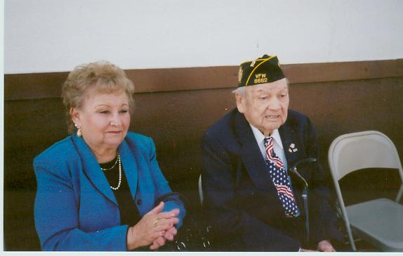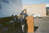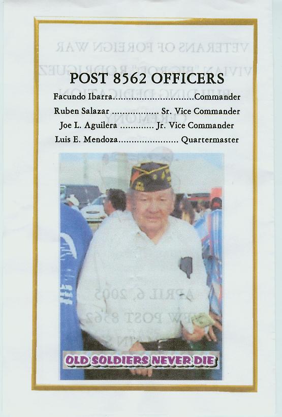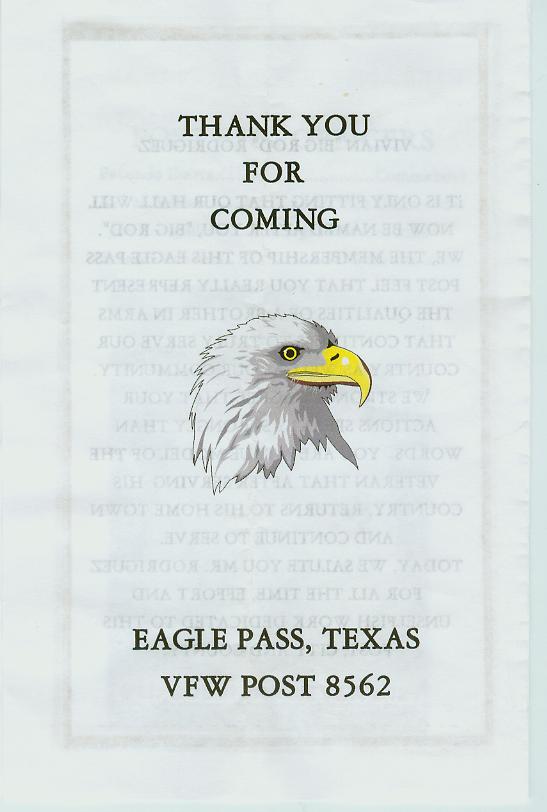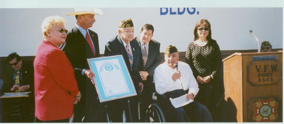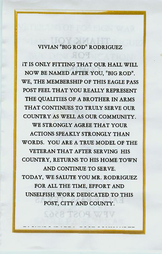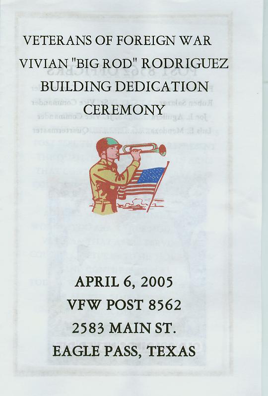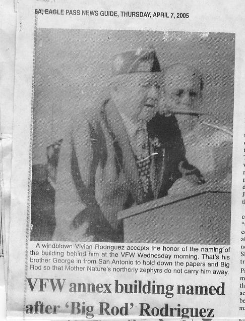 A wind blown Vivian Rodriguez accepts the honor of the naming of the builging behind him at the VFW Wednesday morning. That's his brother George in from San Antonio to hold down the papers and Big Rod so that Mother Natures northerly zepheryrs do not carry him away. |